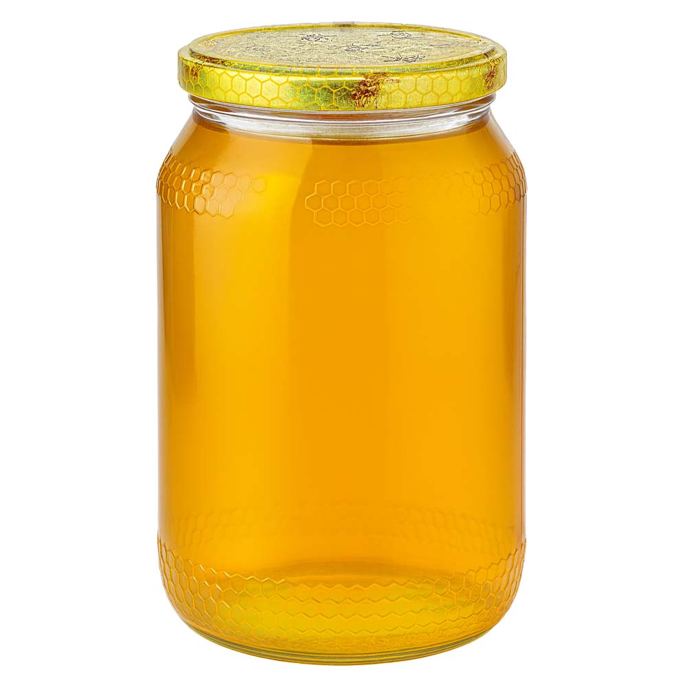 Hochwertiges 1260 g Honigglas mit dekorativem Bienenwaben-Deckel BasicSeal UNiTWIST. Das Wabenmuster verleiht dem Glas eine natürliche und ansprechende Optik, ideal für große Abfüllmengen, Familienportionen und hochwertige Präsentationen im Verkaufsregal.