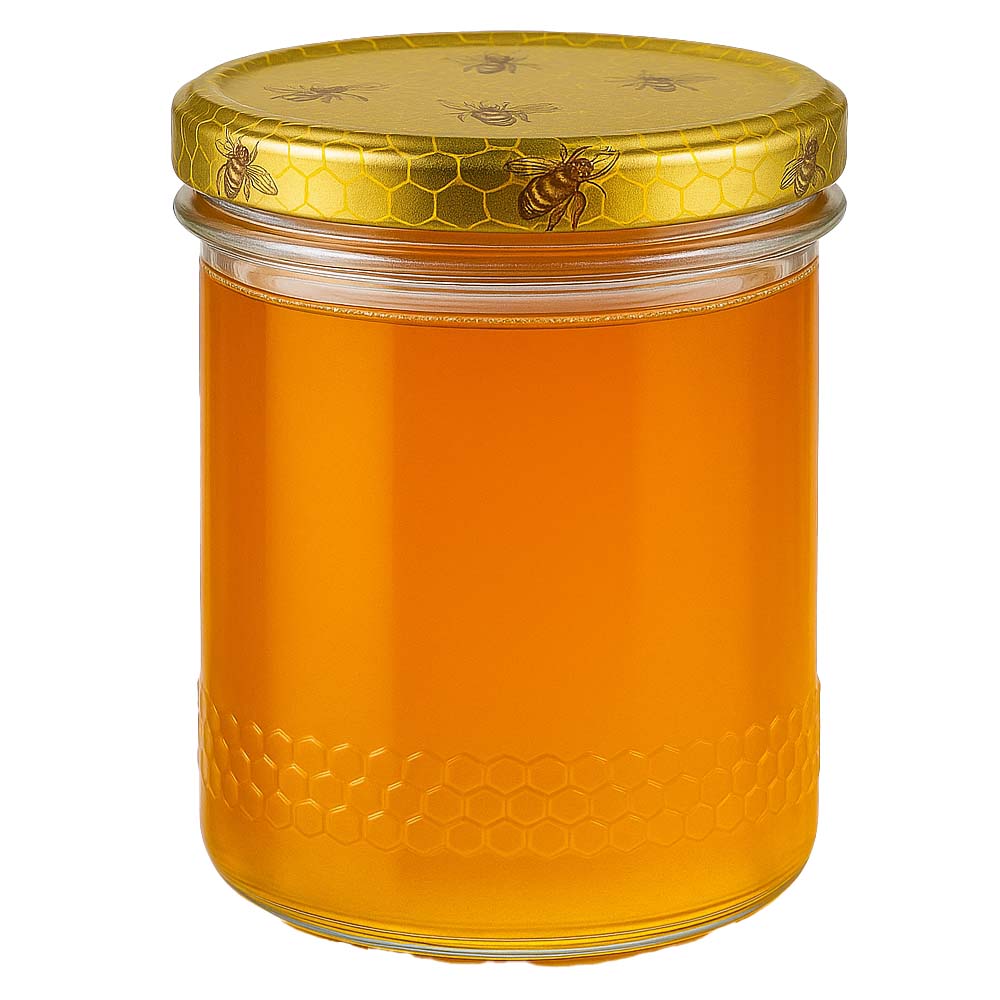 Hochwertiges 560 g Honigglas mit dekorativem Bienenwaben-Deckel BasicSeal UNiTWIST. Das Wabenmuster betont die natürliche Herkunft des Honigs und macht das Glas besonders attraktiv für die Direktvermarktung sowie für Geschenk- und Premiumverpackungen.