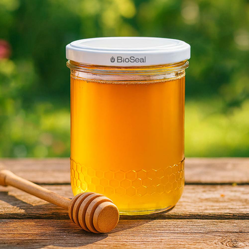 Hochwertiges 560 g Honigglas mit modernem weißem BioSeal UNiTWIST-Deckel. Die klare, hygienische Optik macht dieses Glas ideal für Direktvermarktung, Geschenkverpackungen und hochwertige Präsentationen. Perfekt für Imker, die Wert auf ein modernes Erscheinungsbild legen.